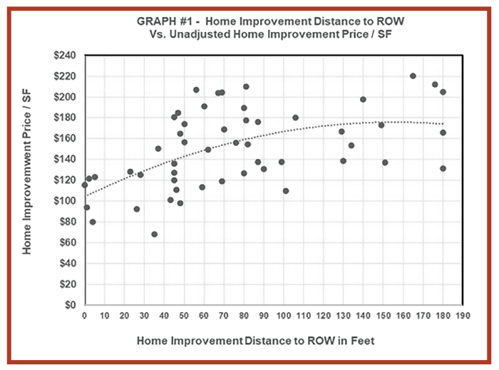 The factual data was tabulated. Prior to any adjustments, the raw data was graphed (Graph #1) using the distance to the ROW of the home improvement versus the overall sale price divided by the home’s square footage to indicate the unit sale price per SF. Based on Graph #1, a best fit line was developed. The graph indicates there is an apparent decreasing price per SF for shorter setbacks. This is encouraging data, so further analysis was performed.