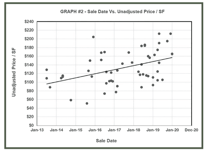 After the concluded adjustments for market conditions were made, the unadjusted sales were graphed and compared against the market adjusted sales. February 2020 was used as the appraisal date. Two very low unit prices and one very high unit price are excluded as they are clearly outliers that skewed the data.