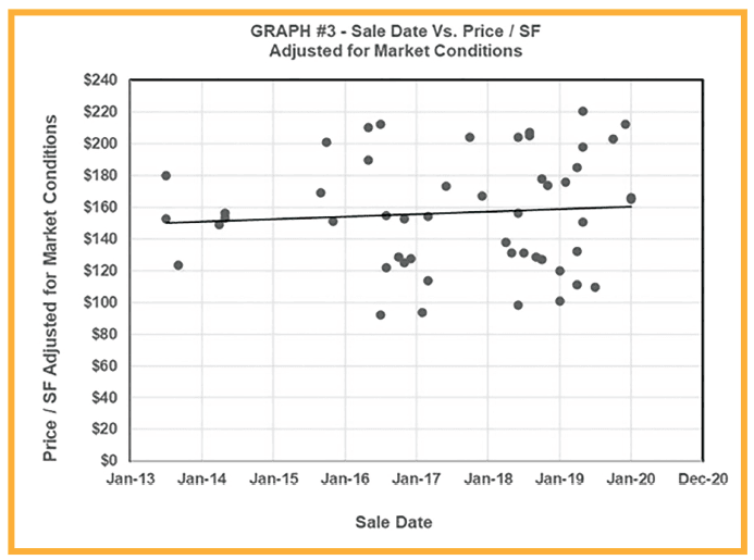 The resulting Graph #3 of sale date versus market adjusted unit prices indicates a nearly level average price, which is expected if the data is adjusted appropriately for market conditions. The data has been normalized to reflect February 2020 prices.