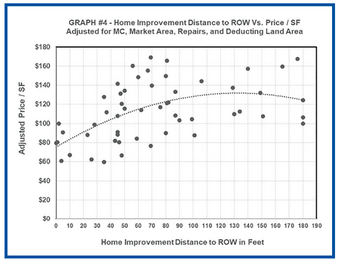 Following this round of direct adjustments, Graph #4 depicts the unit sale price per SF was graphed as a function of the home improvement distance to the ROW. Based on Graph #4, there is an apparent difference in the unit value of the improvements as a function of the home building area.