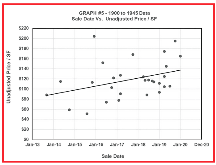 For the 1900 to 1945 data, Graph #5 depicts the unadjusted data was graphed for sale date versus unadjusted home improvement value per SF. Of note is that one sale with a setback of 226.31 feet was assigned a setback at the upper end of the remaining sales, at 150 feet. Because the setbacks of this magnitude are not considered to be affected by this setback, this had no effect on the graph, except for shortening the x-axis for better visualization of most of the data.