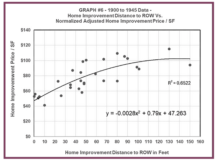 Using Graph #6, for a property constructed in the 1900-to-1945-year range, for a change from 45 feet to the ROW before the project to 20 feet to the ROW after the project, the indicated change, or percentage loss in unit value of the home improvement only is about -20%. Based on a typical improvement value to land value ratio of 60% for this analysis, this represents a change of about -12% to the value of the total property.