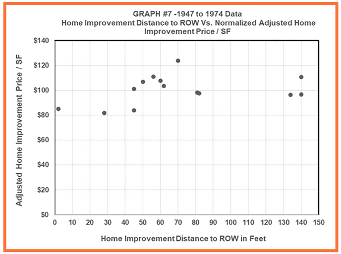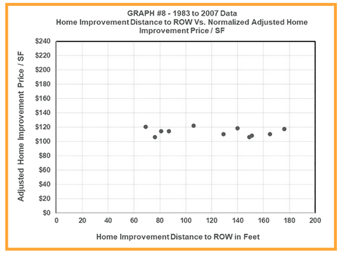 Even after the appraiser adjusted for market conditions, Graph #8 indicates there is no apparent difference in price per SF for the data presented. The appraiser concludes there is no difference in market unit value of the home improvements for distances greater than 69 feet to the ROW for homes constructed between 1983 and 2007.